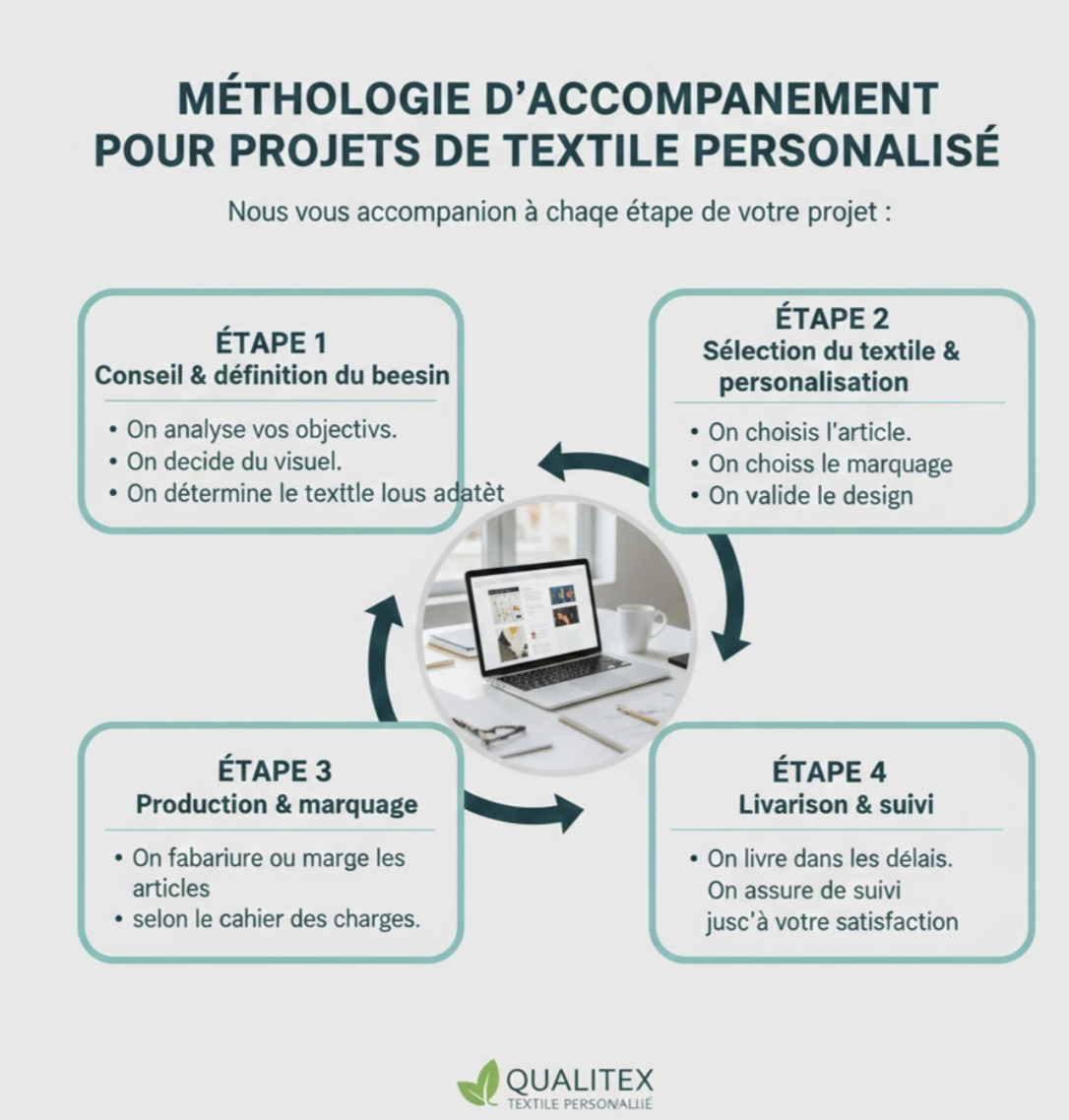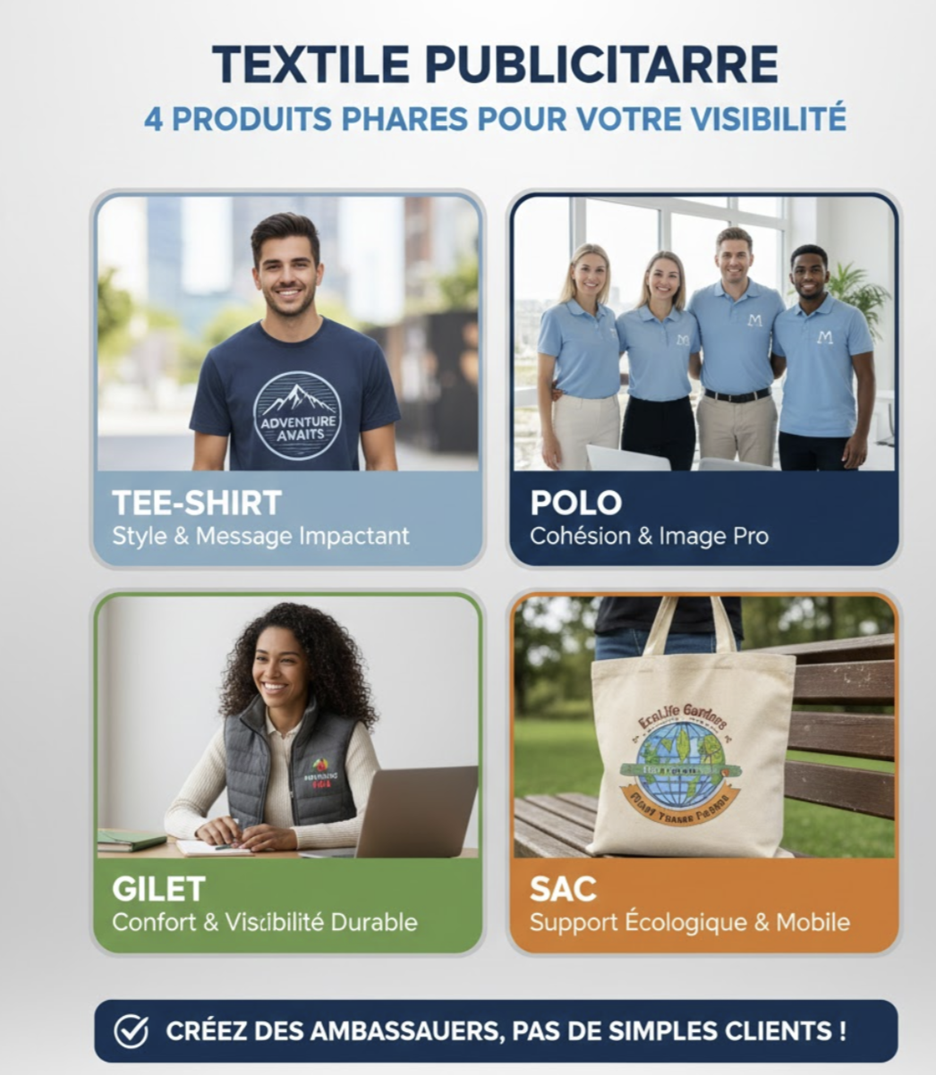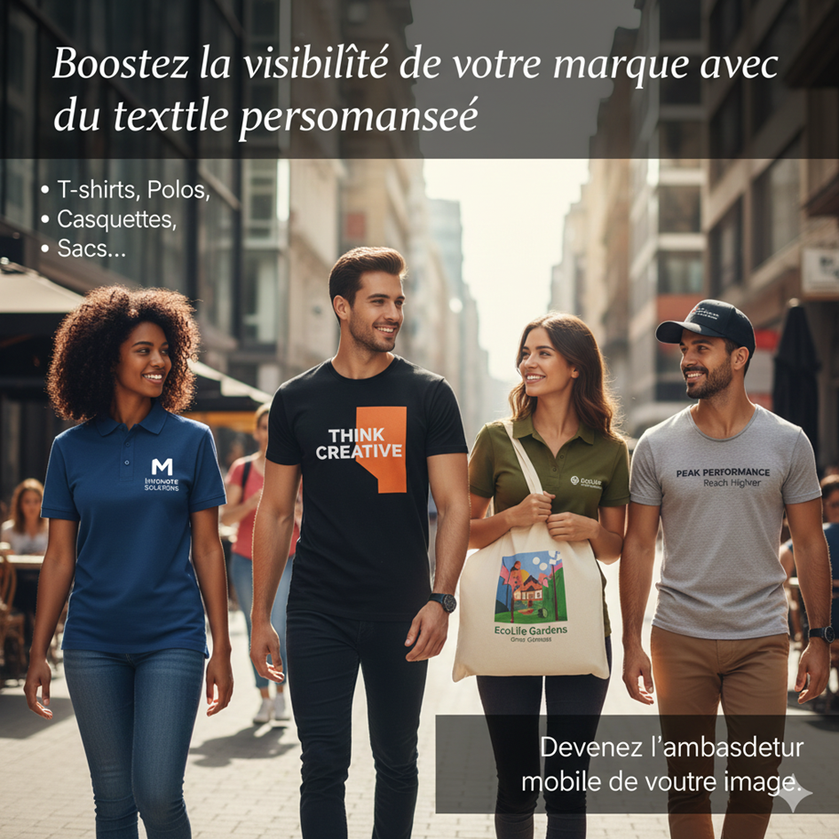Nous proposons une large gamme de textiles personnalisables : t-shirts, polos, sweats, vestes, casquettes, sacs, accessoires… Chaque produit peut être marqué selon vos besoins : logo, message, design, couleurs de votre marque.
